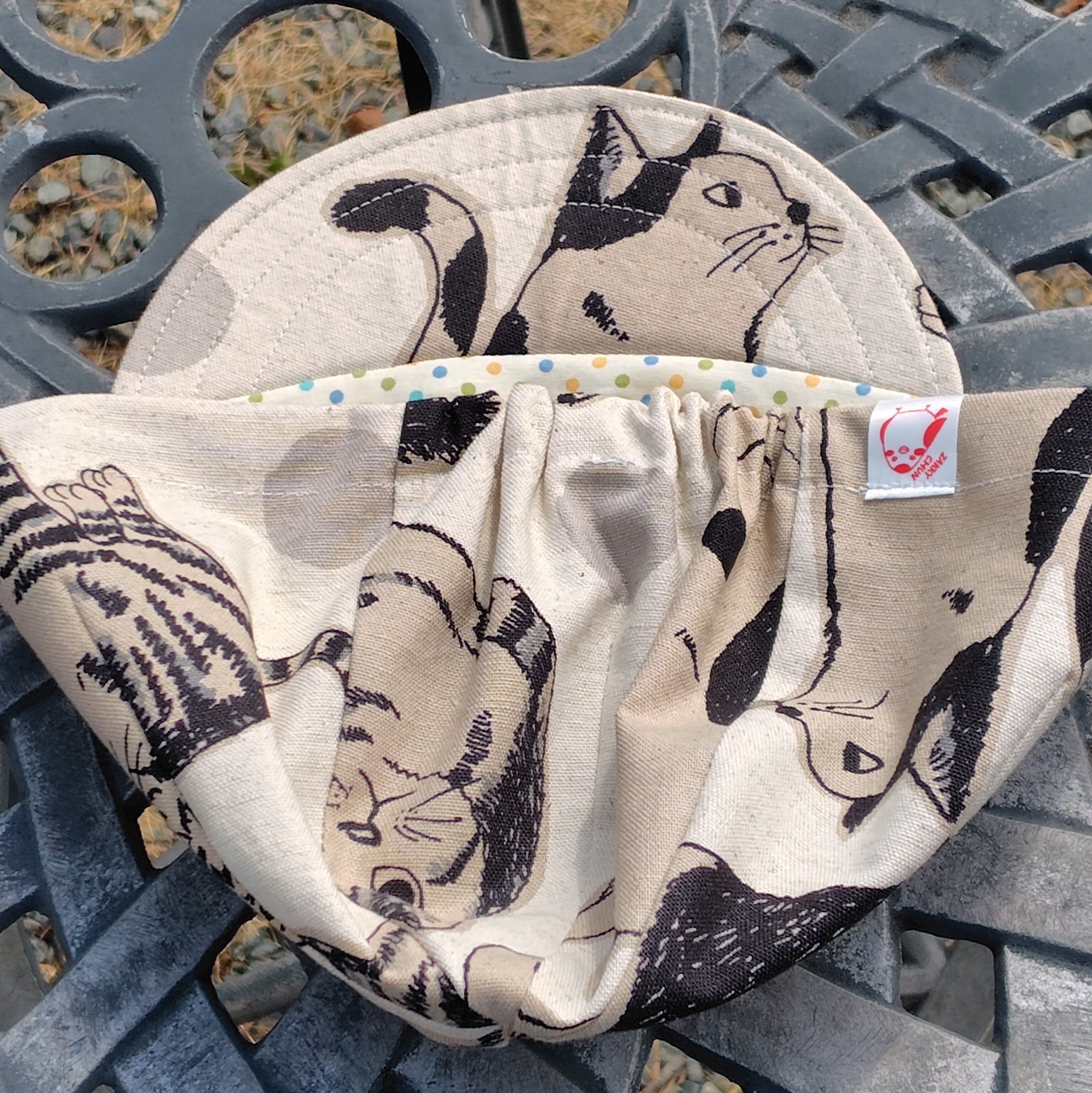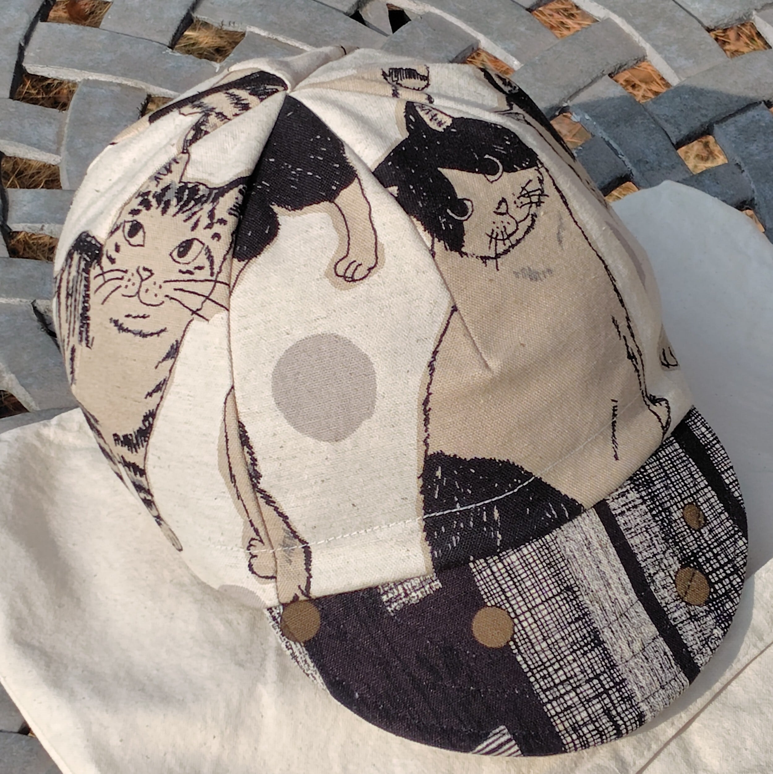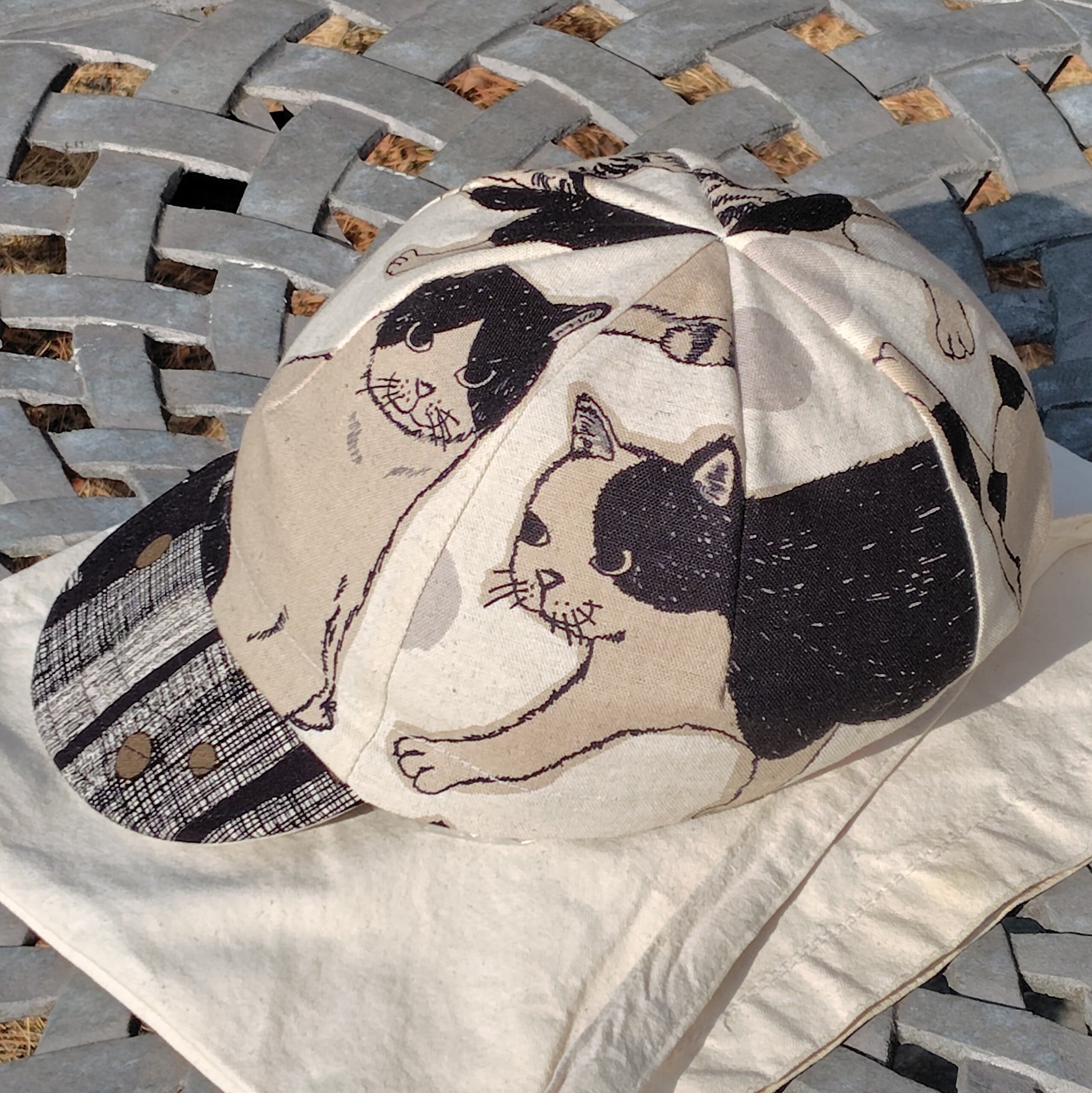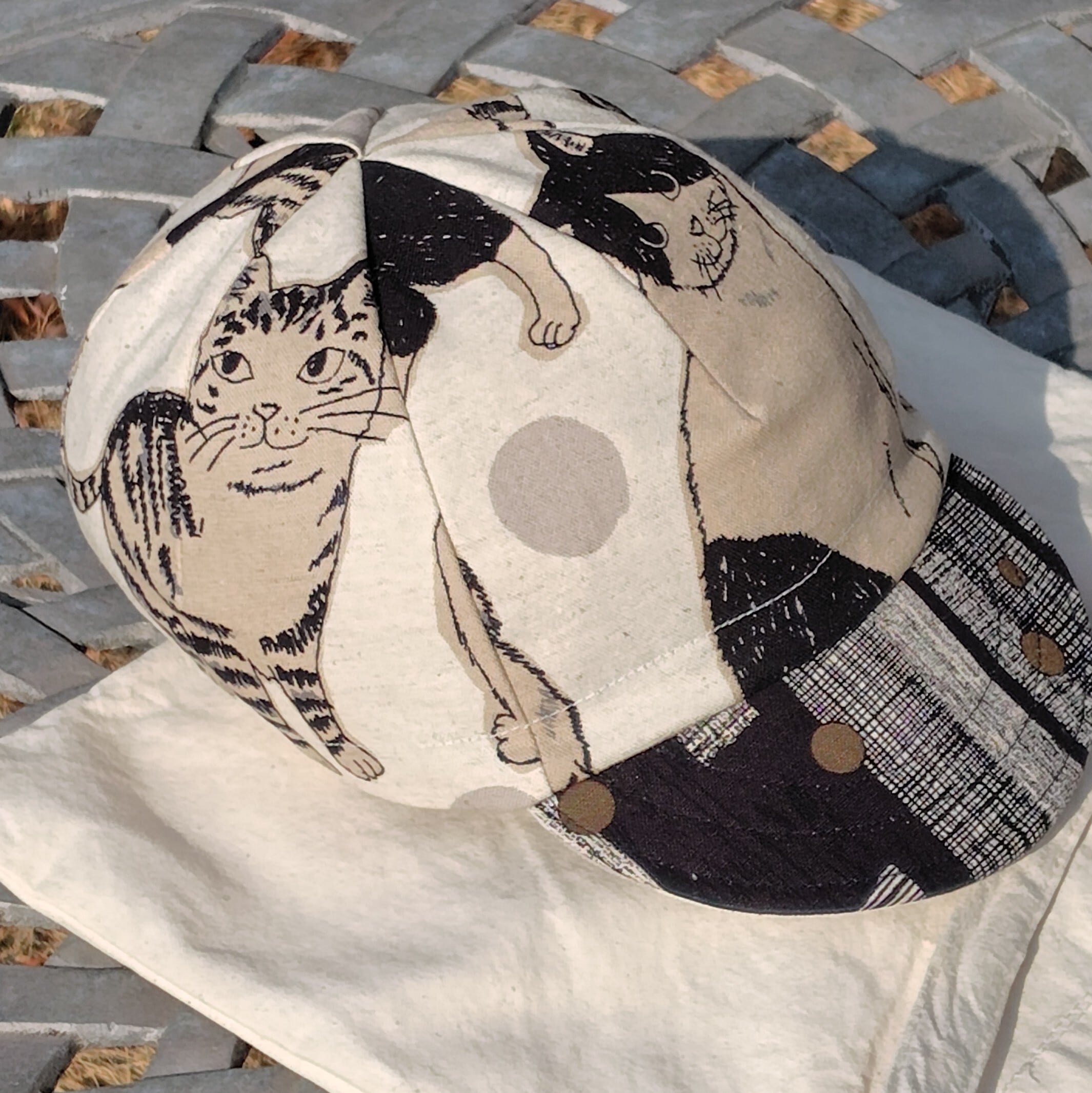 大きな猫柄をキャップの4枚パネルにうまく配置出来るように裁断しました。ツバを上げればそこにも猫の顔。